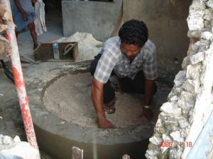 Maldivian islander trained to make bricks and lay foundation for his home’s new water tank after Tsunami.